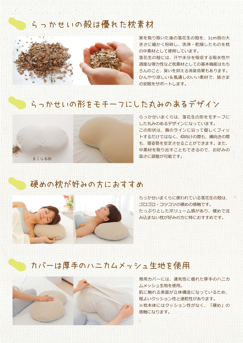 また、「らっかせいまくら」という商品名ではありますが、落花生の実は使用しておりません。